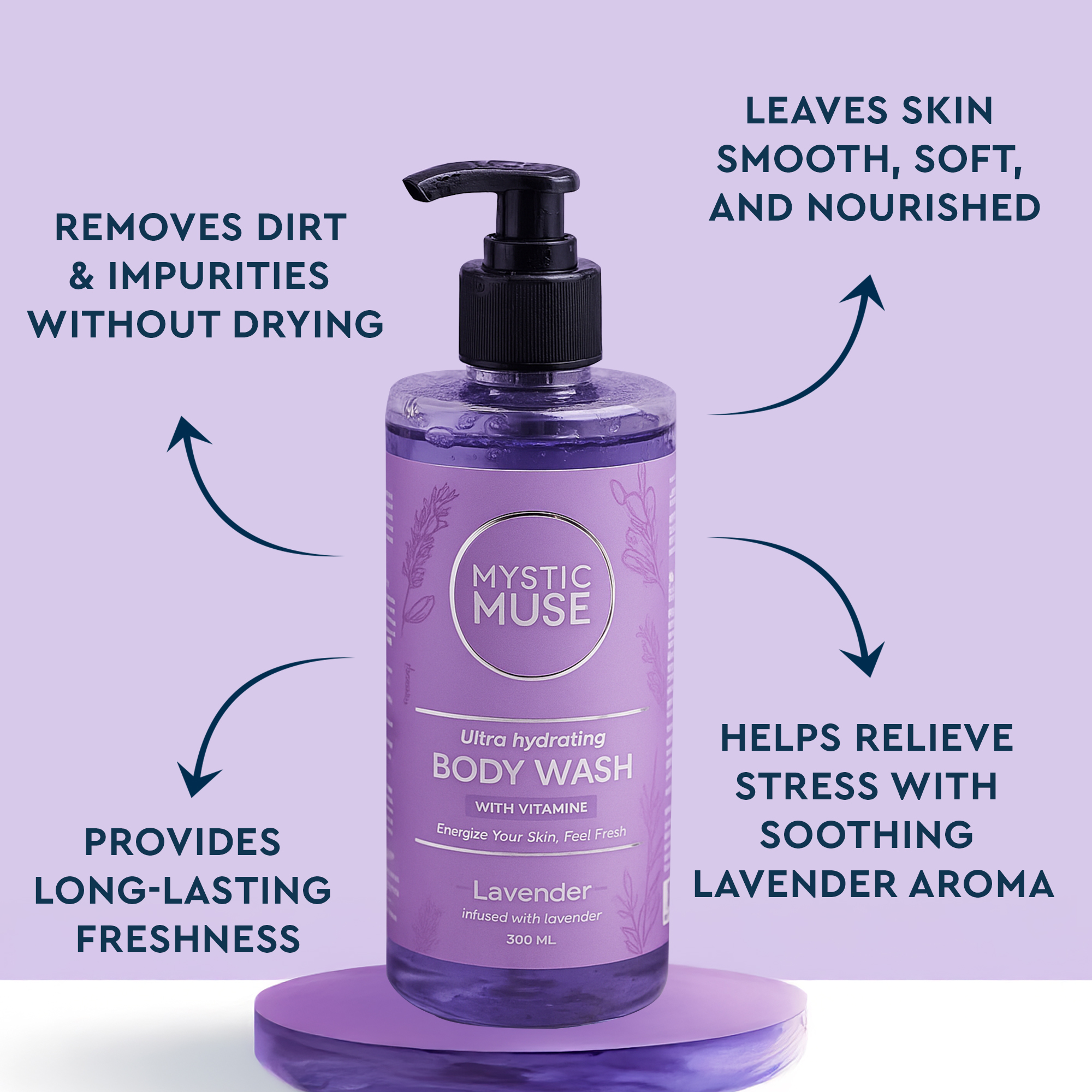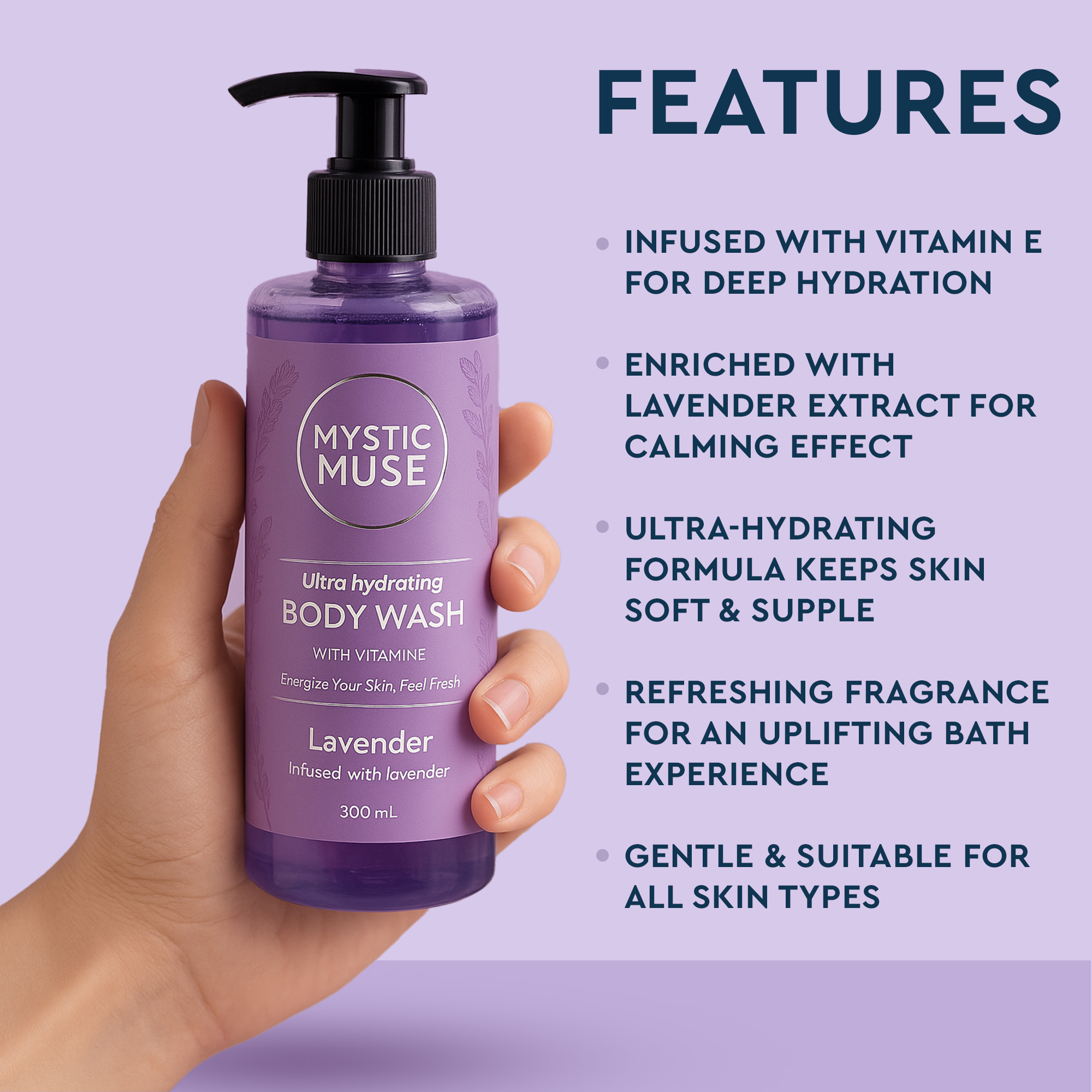 Revitalize your body and mind with Mysticmuse Natural Body Wash. This 300ml formula gently cleanses while the calming aroma creates a spa-like experience. Your skin will feel soft, refreshed, and lightly scented.